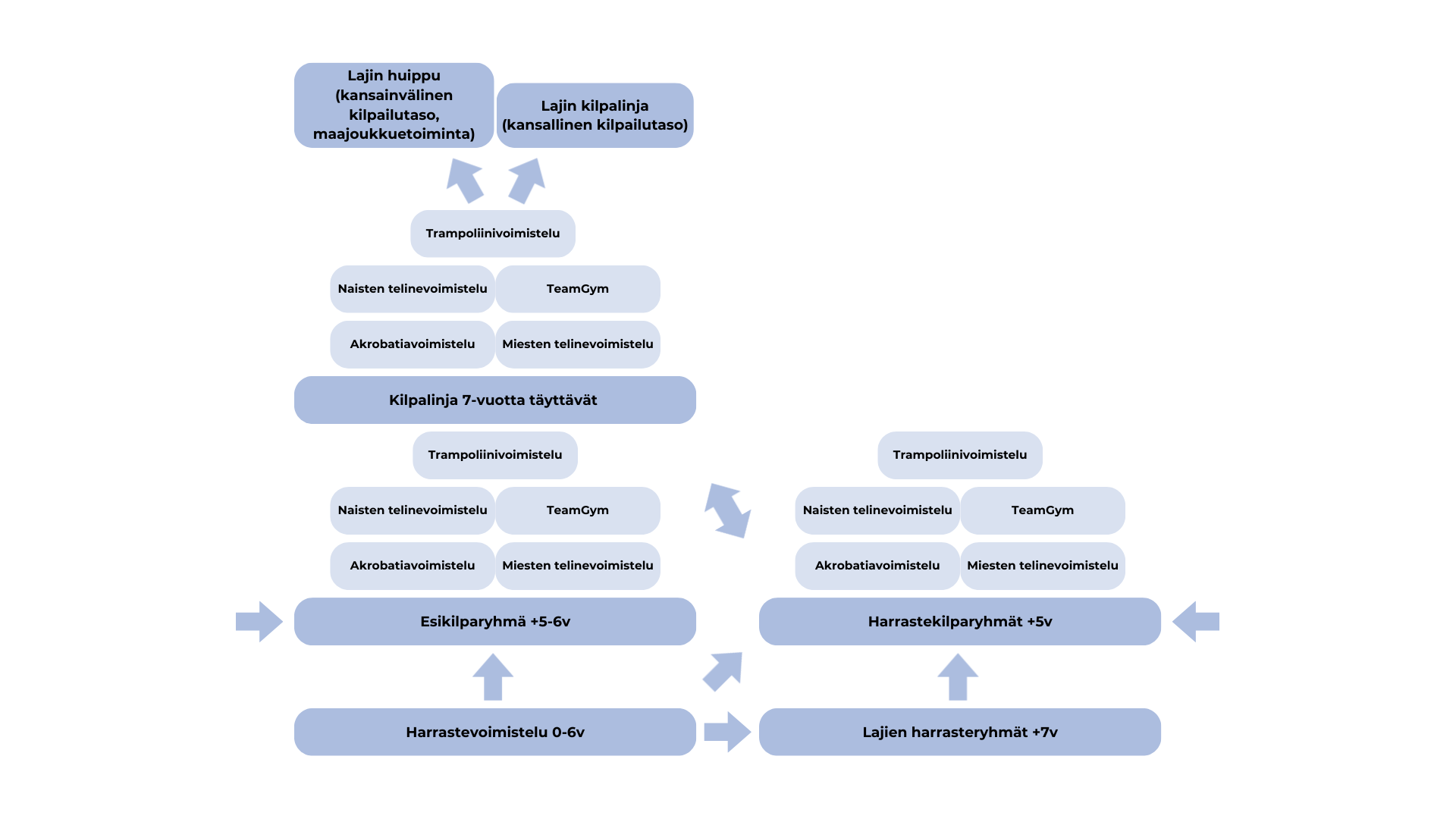 Kilpaileminen Voimisteluliiton lajeissa alkaa osallistumisella Stara-tapahtumaan. Siellä ei anneta vielä pisteitä vaan suullinen kommentti voimistelijan ikätaso huomioiden. Eteneminen luokasta toiseen tapahtuu hieman lajista riippuen pääsääntöisesti kehittymisen ehdoilla tai ikäkausittain. Nousu määräytyy ensi vaiheessa valmentajan arvion mukaan, ja myöhemmin lajeissa voi olla käytössä myös ns. nousupisteet, jotka pitää saavuttaa luokkanousun saavuttamiseksi.