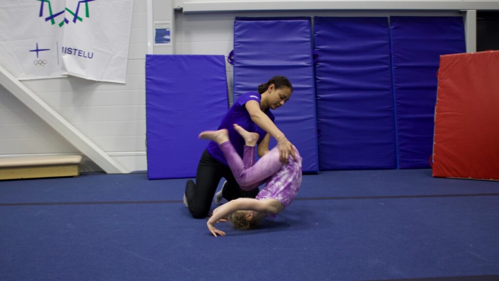 Tyttöjen telinevoimistelussa harjoitellaan lajin neljää telinettä: hyppy, nojapuut, puomi, permanto. Lisäksi harjoituksia tehdään esimerkiksi trampoliinien ja montun avulla. Taso 1: Kokemus voimistelukoulusta suositeltavaa, mutta voi aloittaa myös ilman aiempaa kokemusta. Taso 2: Taitovaatimuksena kuperkeikat eteen ja taakse, kärrynpyörä, hyvä käsilläseisonta-asento tuettuna ja kieppi. Taso 3: Taitovaatimuksena kärrynpyörät molempiin suuntiin, siltakaato, kiintopyörähdys. Taso 4: Taitovaatimuksena heilunnat […]