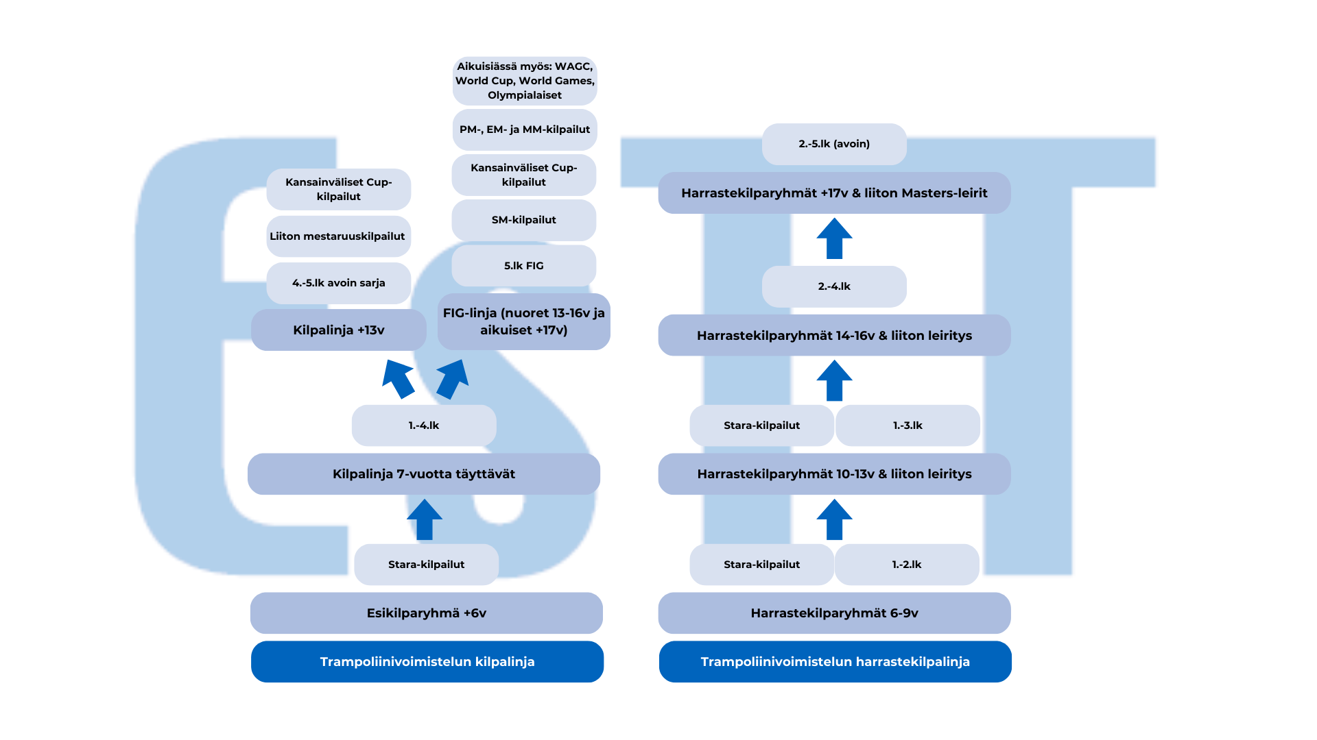 Tavoitteellinen valmennus pyritään aloittamaan esikouluiässä, ja eteneminen tapahtuu kilpailujärjestelmän portaita pitkin. EsTT:llä on trampoliinivoimistelun kilparyhmiä esikilparyhmästä ylöspäin aina kansalliselle huipulle asti. Trampoliinivoimistelun kilparyhmät harjoittelevat Leppävaarassa Kameleontenissa.
